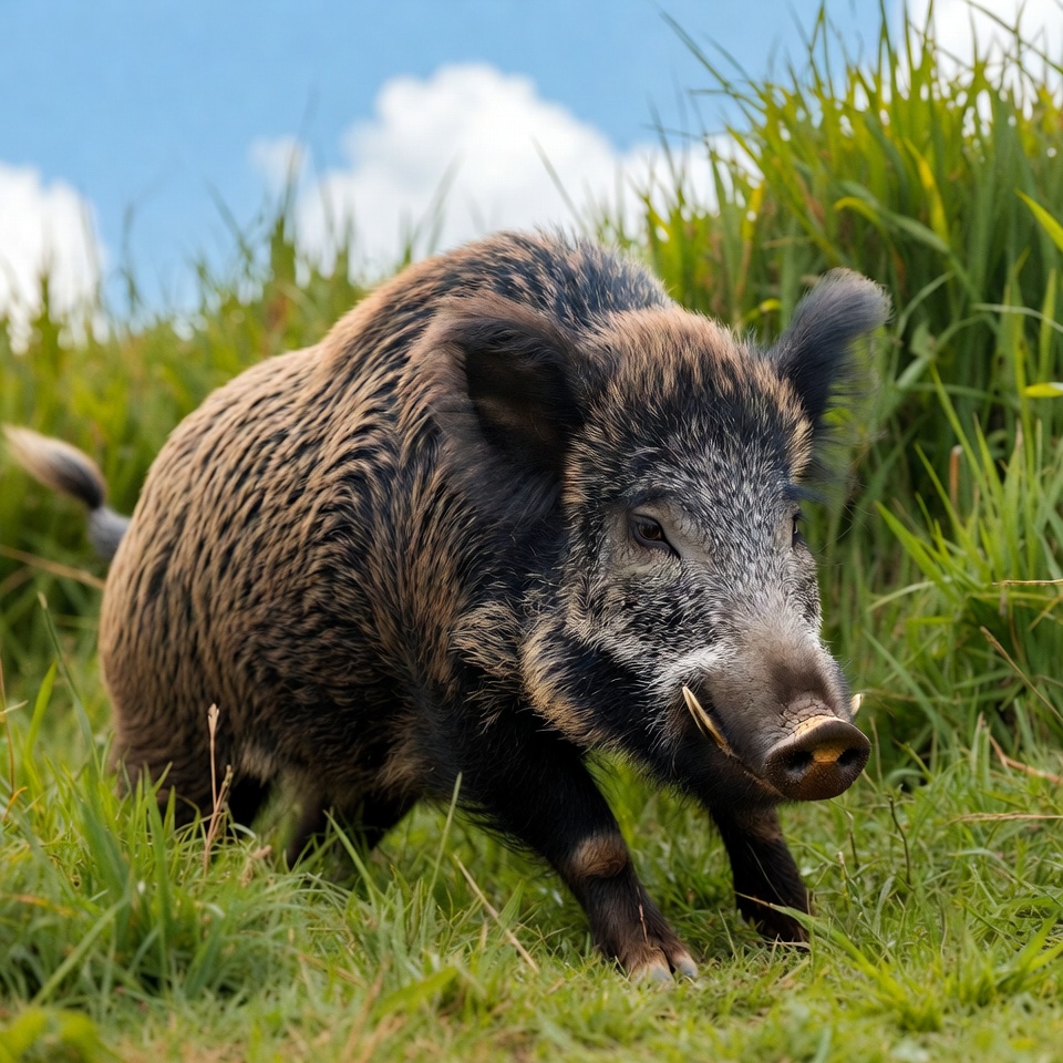 A wild boar moves quickly through tall grass under a blue sky with clouds. The animal appears alert and active in its natural habitat.