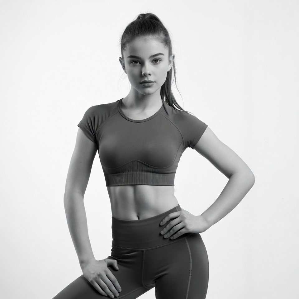 A young person poses in workout clothing against a plain backdrop. They stand confidently with one hand on their hip, showcasing their fitness look.