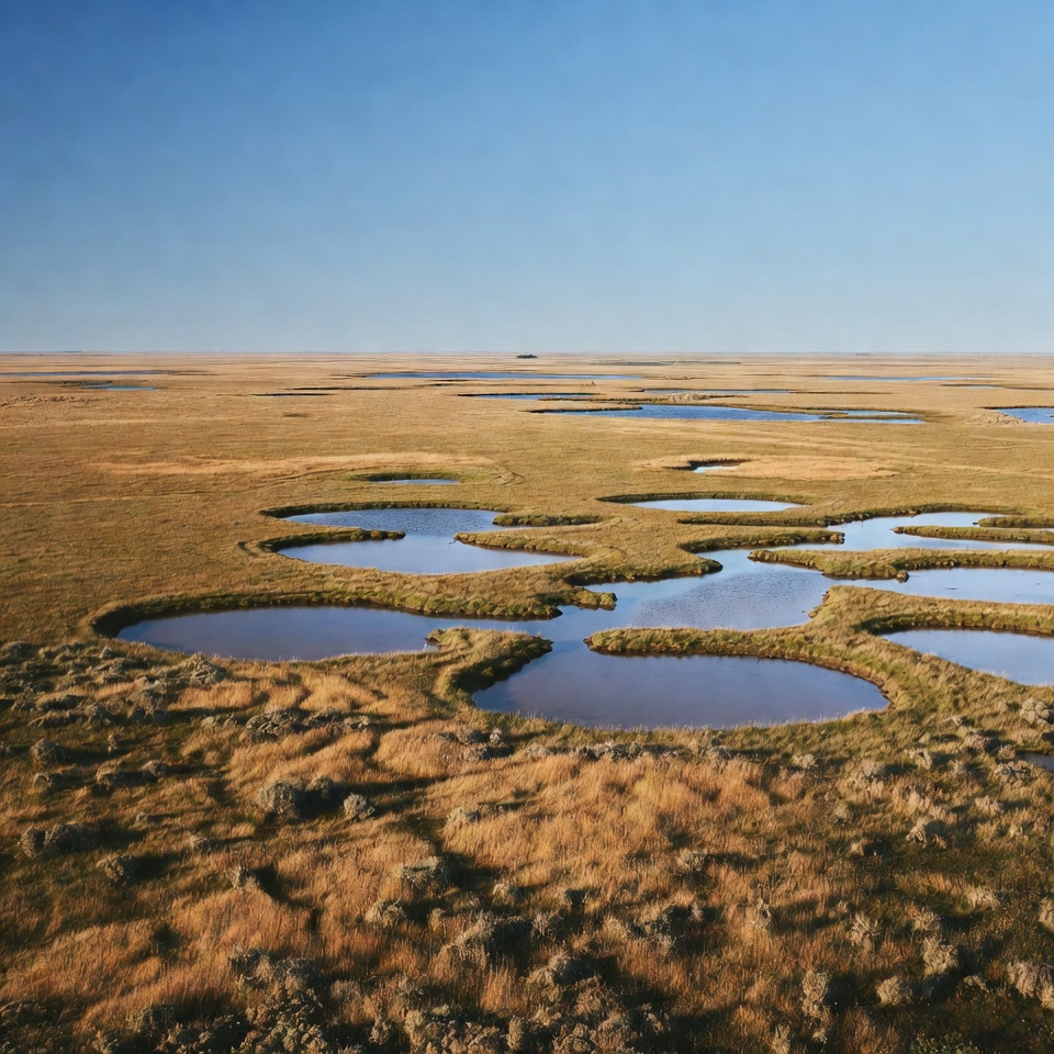 The scene shows wetlands with various ponds surrounded by grass. The sky is blue and clear, highlighting the natural landscape.