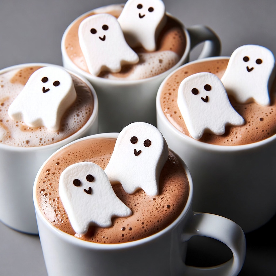 Four cups of hot chocolate sit on a table. Each cup has a ghost-shaped marshmallow floating on top.