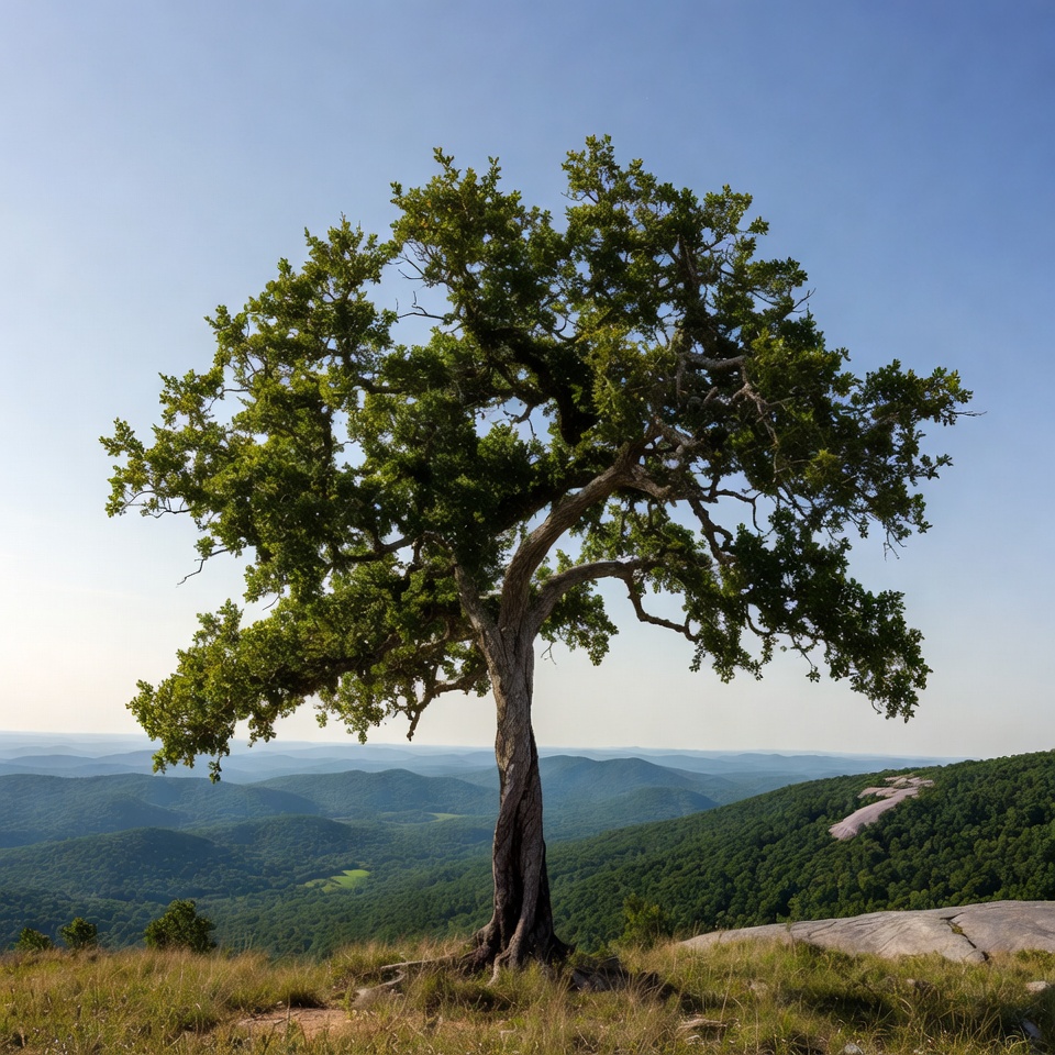 A tree stands alone on a hillside. The landscape features rolling hills and a clear sky. Green foliage contrasts with the blue backdrop.