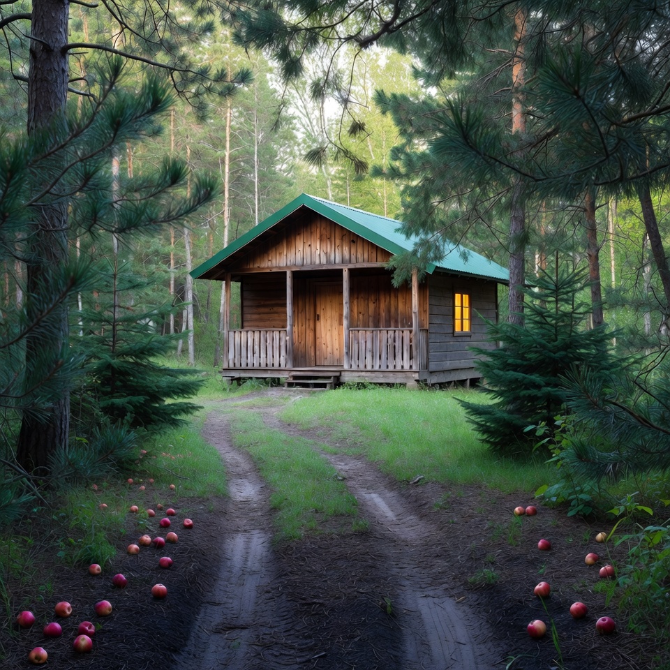 A wooden cabin stands at the end of a dirt path in a lush forest. Red apples are scattered along the path. Light shines from a window.