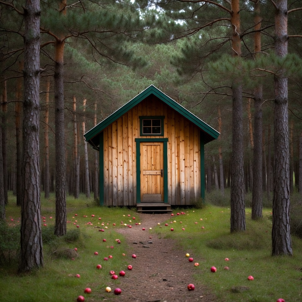 A small wooden house stands in a forest. Red apples lie scattered along the path leading to the door. Tall trees surround the scene.
