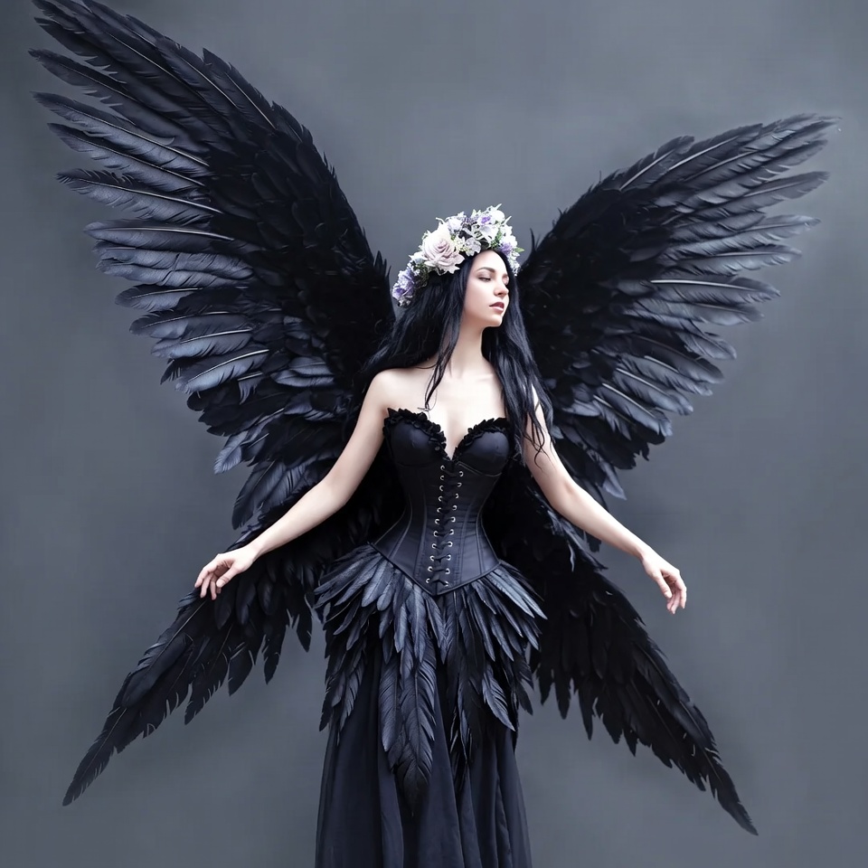 black feathers, black outfit, contrast, costume design, creative, dark angel, dramatic pose, fantasy, fashion, floral crown, flowers, model, mystical, nature, portrait, props, silhouette, studio, winged figure, wings