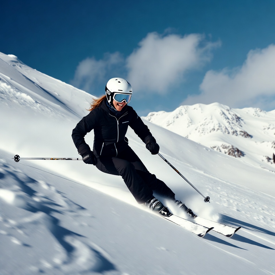 A person skis down a snowy mountain slope during winter. The sky is blue, and mountains are visible in the background.
