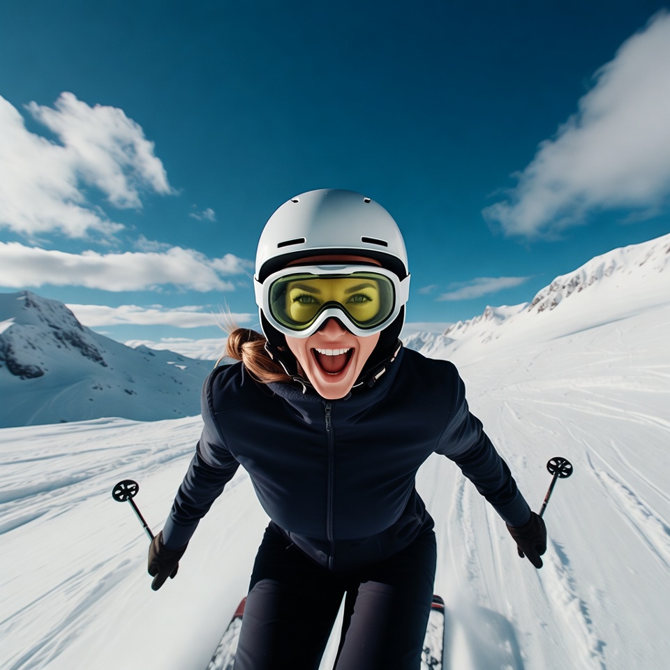 active, adventure, blue sky, cold, daylight, fun, gear, goggles, joy, mountains, outdoor, recreation, skier, skiing, slope, snow, snowflakes, speed, sport, winter