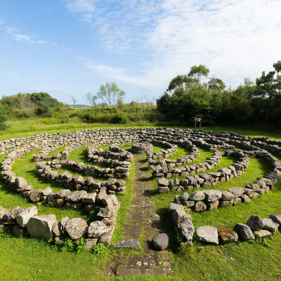 A stone labyrinth sits in a green field surrounded by trees. The sun shines brightly in the sky. Visitors explore the winding paths.