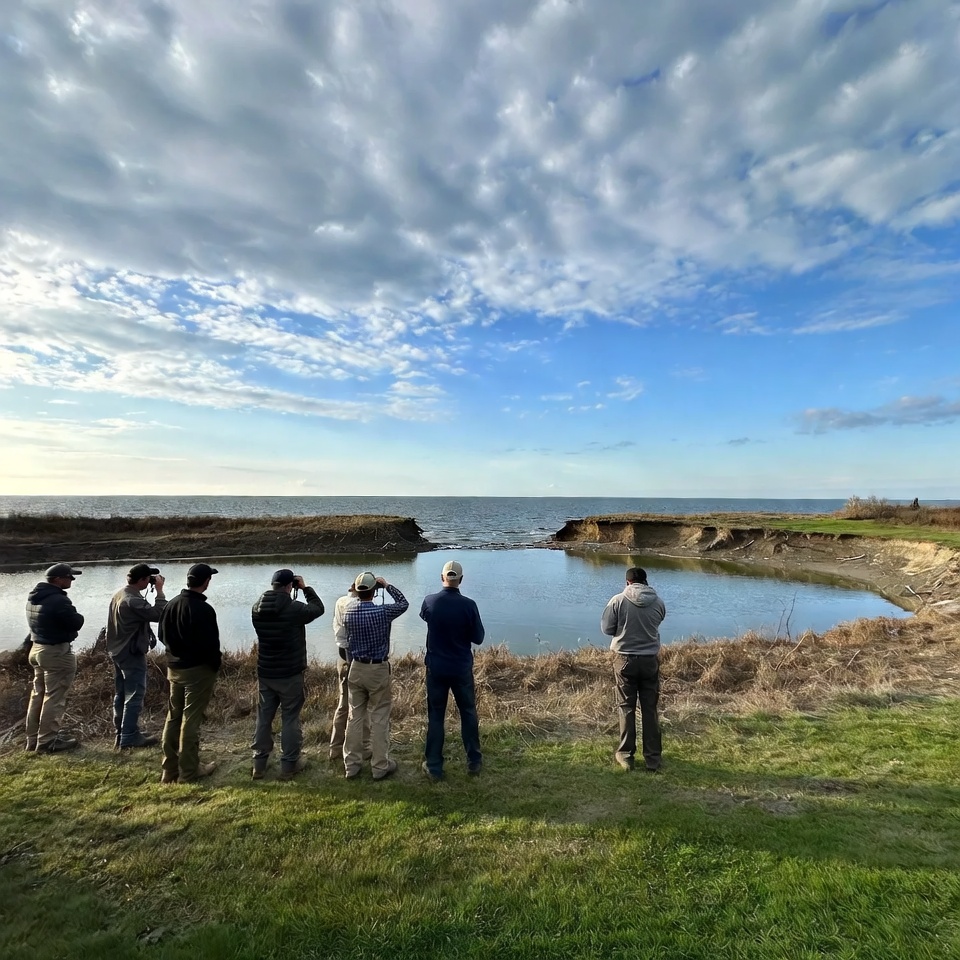 A group of individuals stand by a water body, observing the view while taking photos at a location near the shore.