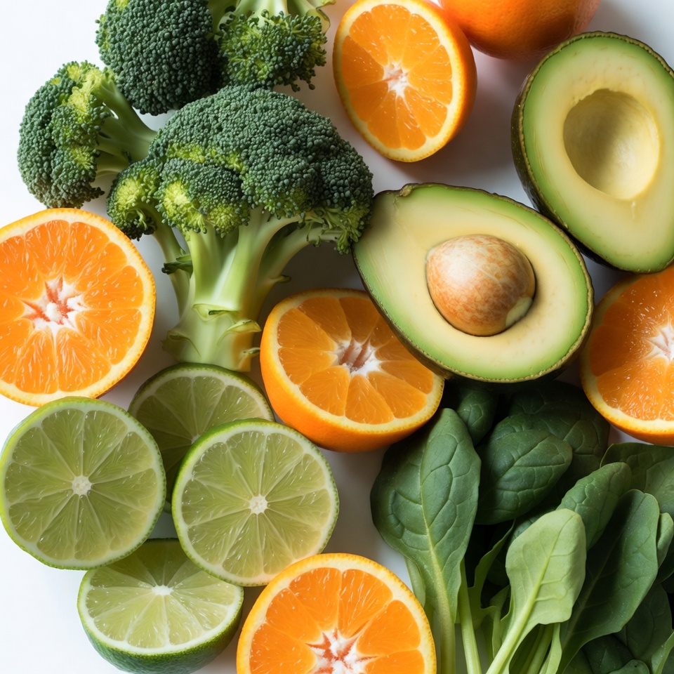 Various fruits and vegetables are laid out on a table. Green broccoli, bright oranges, limes, and half an avocado are visible.