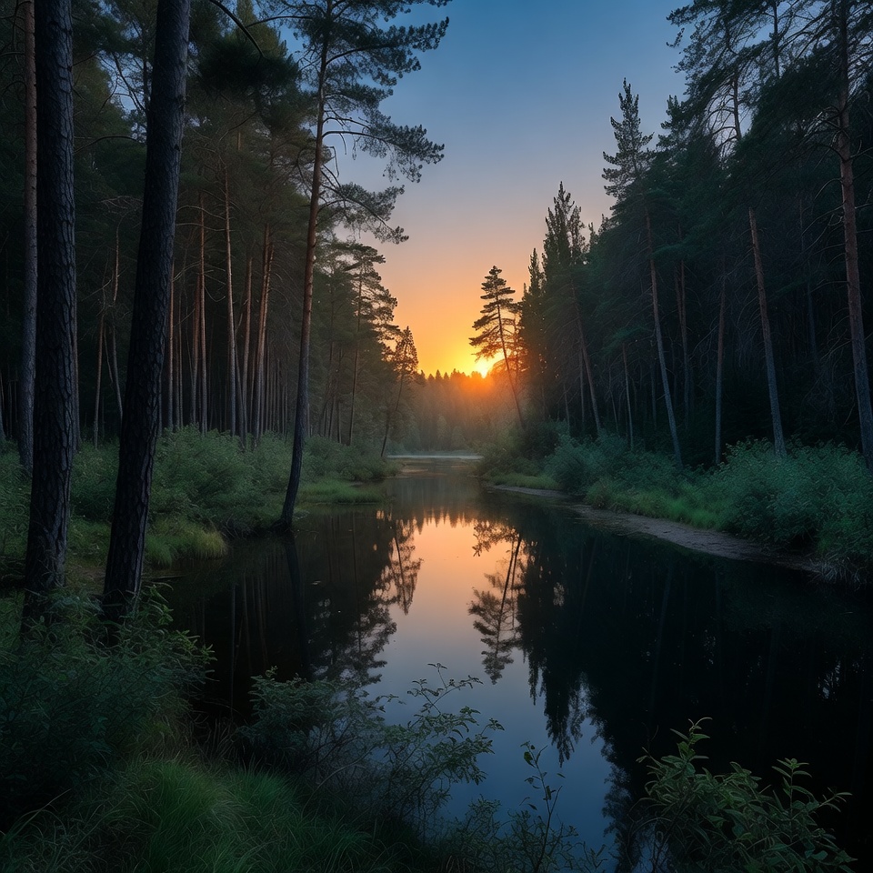 dusk, environment, evening, foliage, forest, landscape, light, nature, outdoor, pathway, reflection, river, scenery, scenic, serene, sunset, tranquility, trees, water, woods