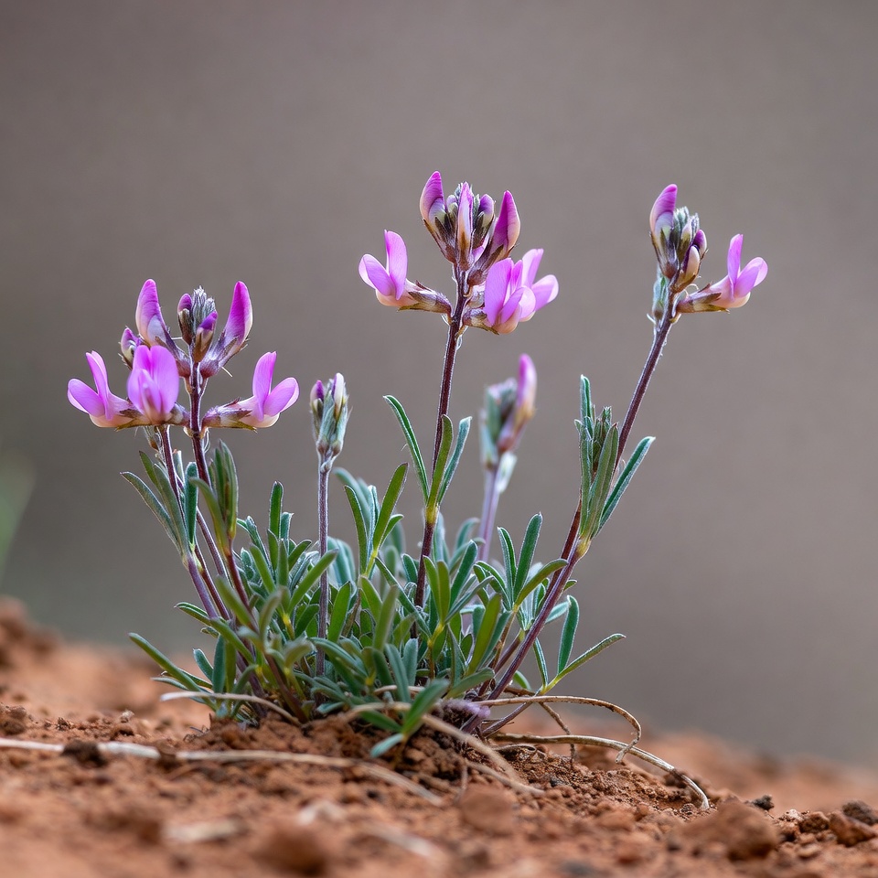 Purple wildflowers grow from the dry soil in a desert area. Green leaves surround the delicate blossoms under the sunlight.
