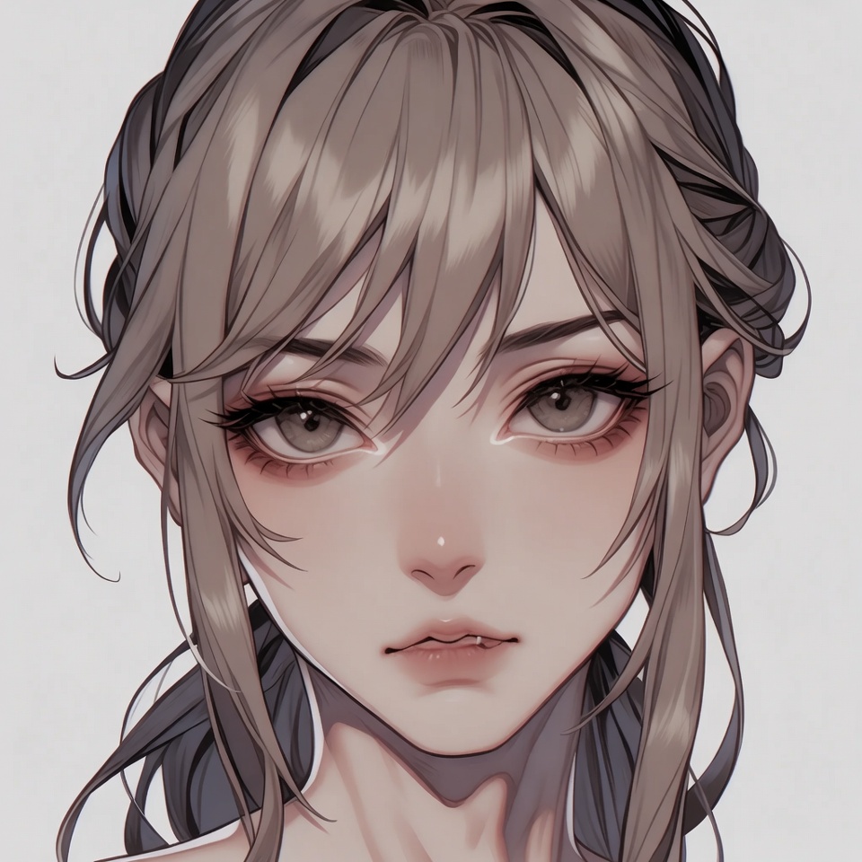 anime, art, beauty, braid, character, dark, digital, expression, eyes, face, features, female, hair, illustration, neutral, portrait, serious, style, woman, young