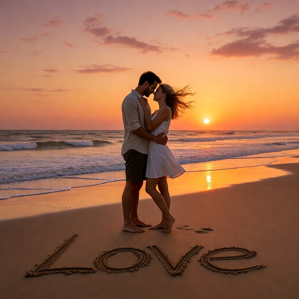 A couple stands together on a beach at sunset. They embrace while waves roll in. The word love is drawn in the sand nearby.