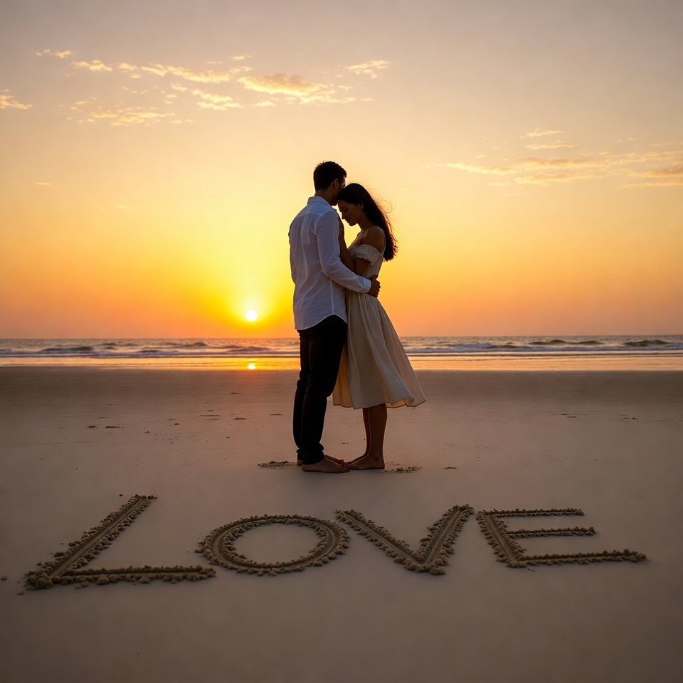 A couple stands on the beach at sunset, sharing an embrace. They are surrounded by the ocean, with the word love written in the sand.