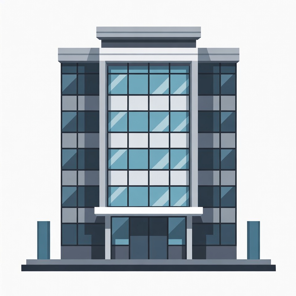 A tall building with a glass facade and a simple entrance stands against a plain background. The design is clean and contemporary.