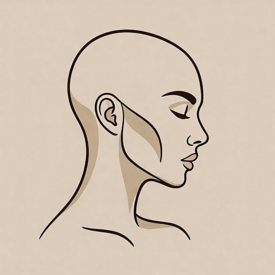 An outline of a bald human head is shown in profile view. The drawing highlights the neck and facial features without hair.