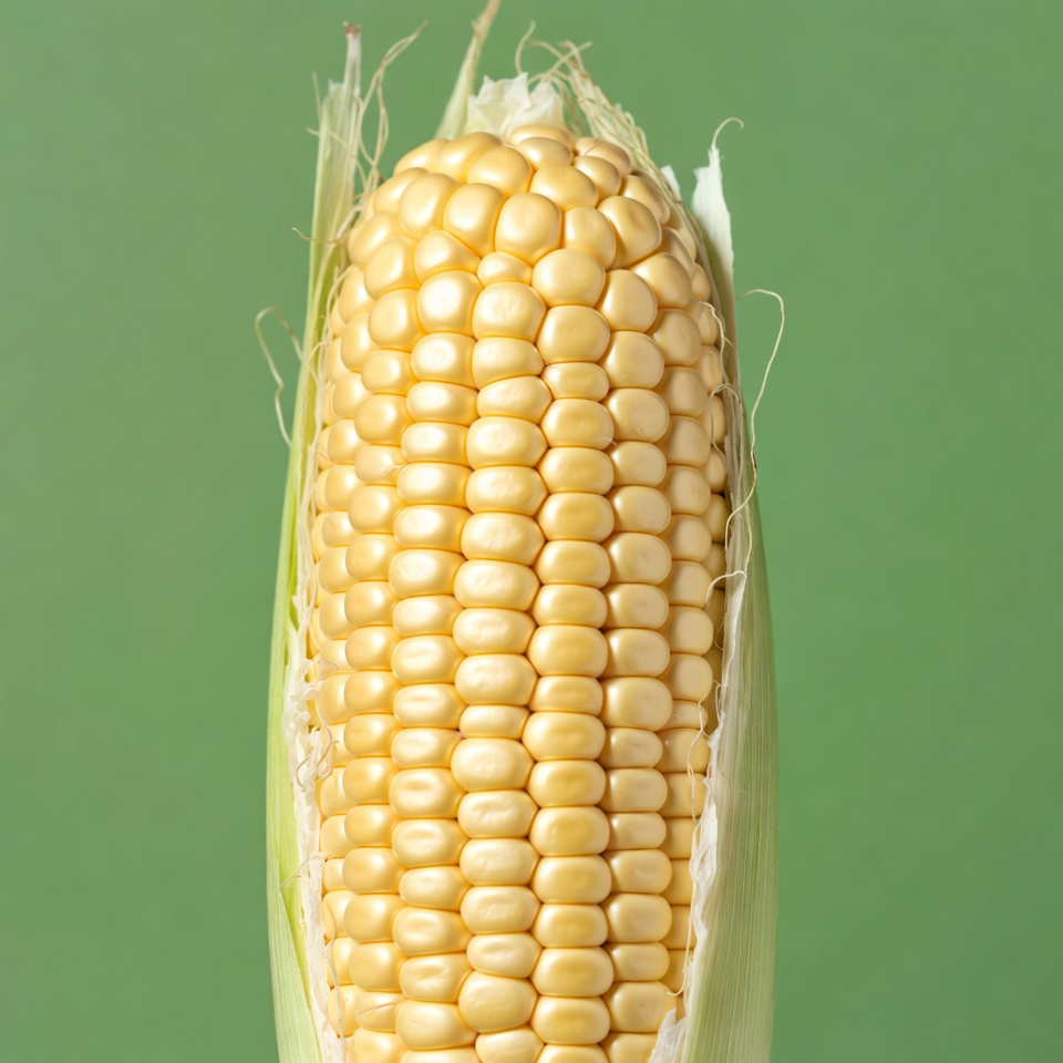 Corn stands upright against a green background. The kernels are yellow and shine in the light. It shows the details of the husk.