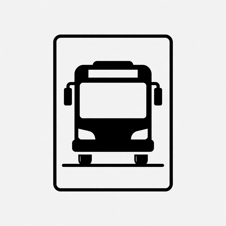 A black silhouette of a bus is placed inside a rectangular boundary. This design represents public transportation and urban transit systems.
