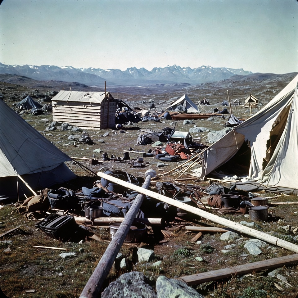 A group sets up tents and shelters in a rugged area. Rocky terrain and mountains provide a backdrop. Equipment is scattered around.