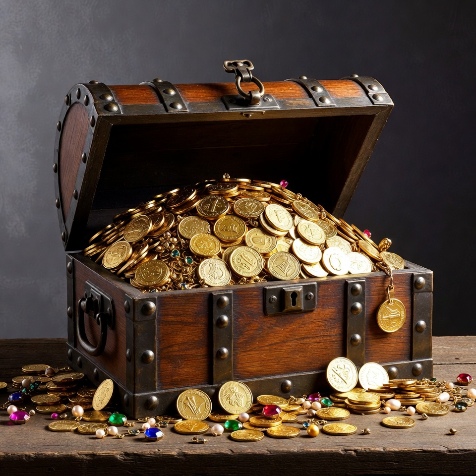 A wooden chest is open, showing a large amount of gold coins inside. Some coins are scattered on the table around the chest.