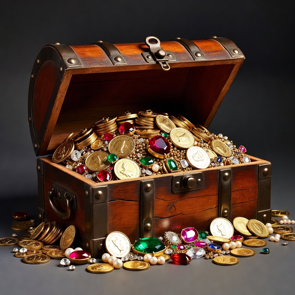 chest, chest content, coins, collectible, display, gems, gold, jewelry, metal, open, overflowing, pattern, pirate, riches, shiny, treasure, valuables, vintage, wealth, wooden