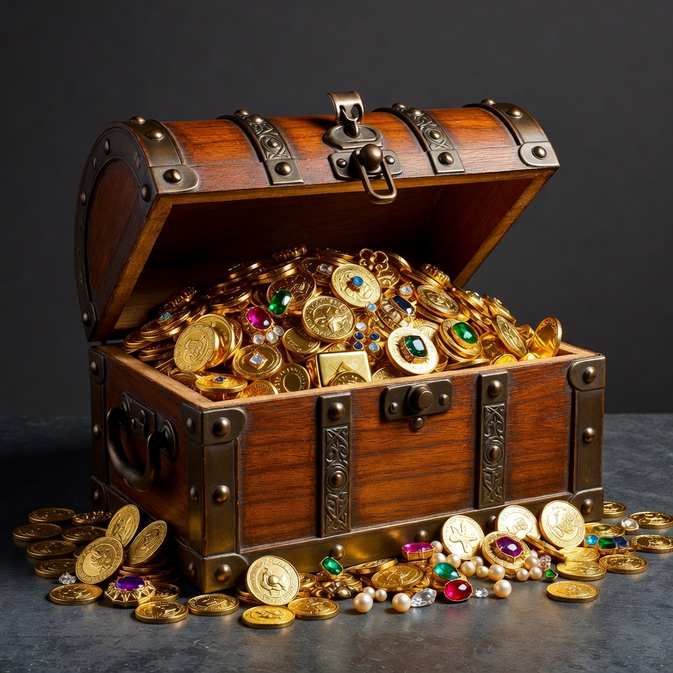 adventure, artifacts, chest, coins, collection, fantasy, gems, glimmering, gold, jewelry, open, overflowing, pirates, riches, shiny, treasure, trinkets, valuables, wealth, wooden