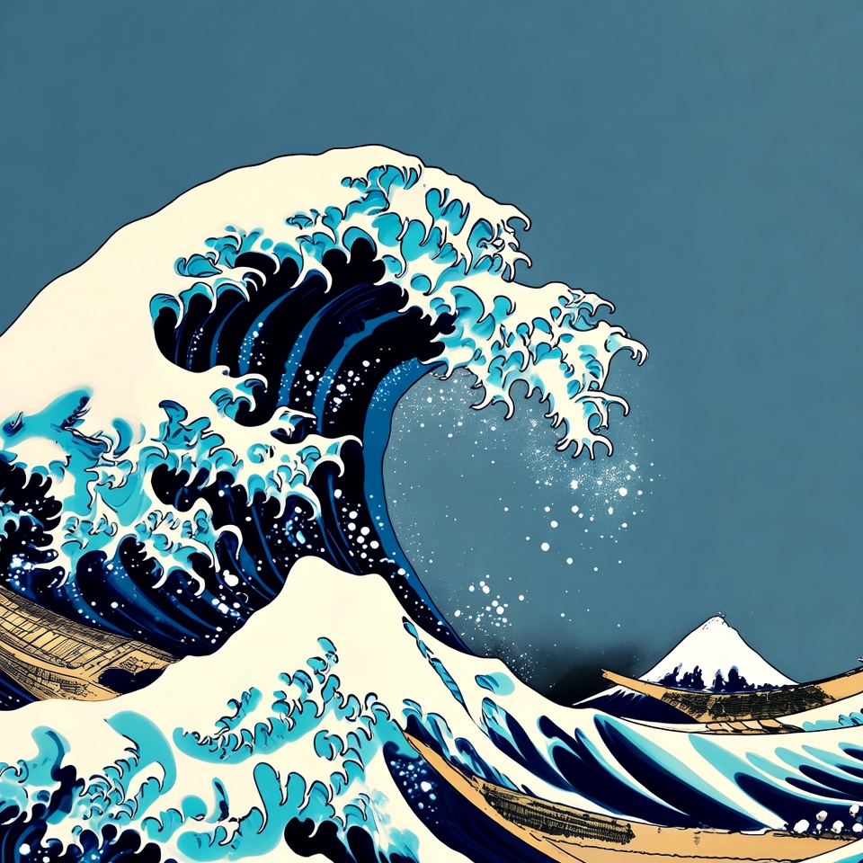 Fuji, Hokusai, Japanese art, art, artwork, blue, coastline, curl, design, flowing, graphic, landscape, mountain, nature, ocean, sea, splash, surf, water, wave