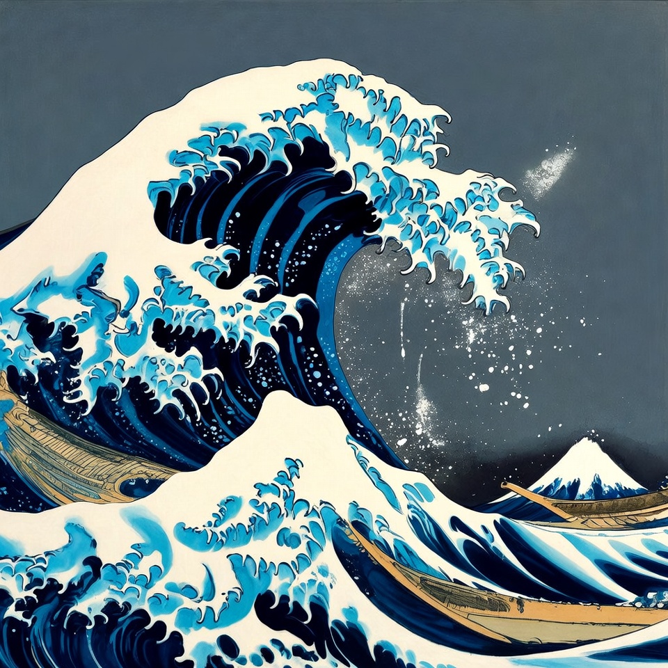 Waves crash against boats in a stormy sea. Mount Fuji stands in the background under a gray sky. It captures a moment of natural force.
