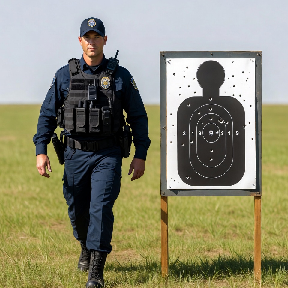 A law enforcement officer walks towards a target board during a training session at an outdoor shooting range in bright daylight.