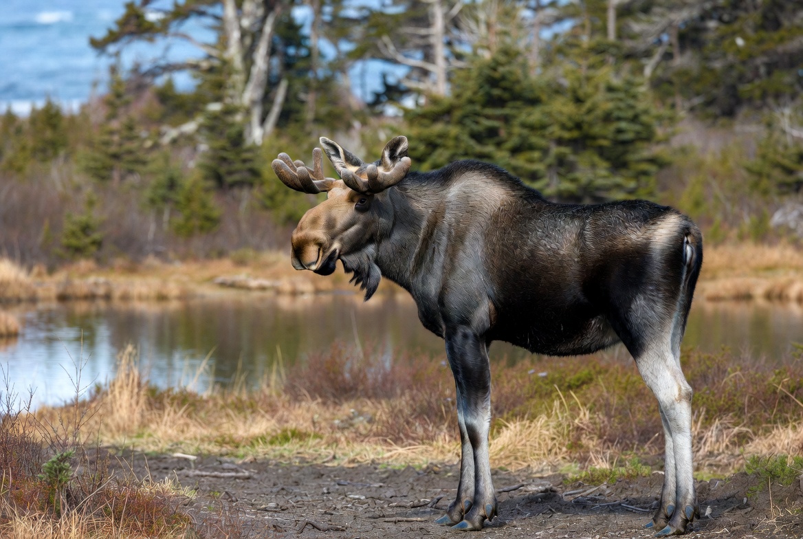 animal, environment, fauna, forest, grass, habitat, herbivore, landscape, large mammal, male moose, moose, nature, outdoors, pond, scenic, tranquil, trees, water, wilderness, wildlife