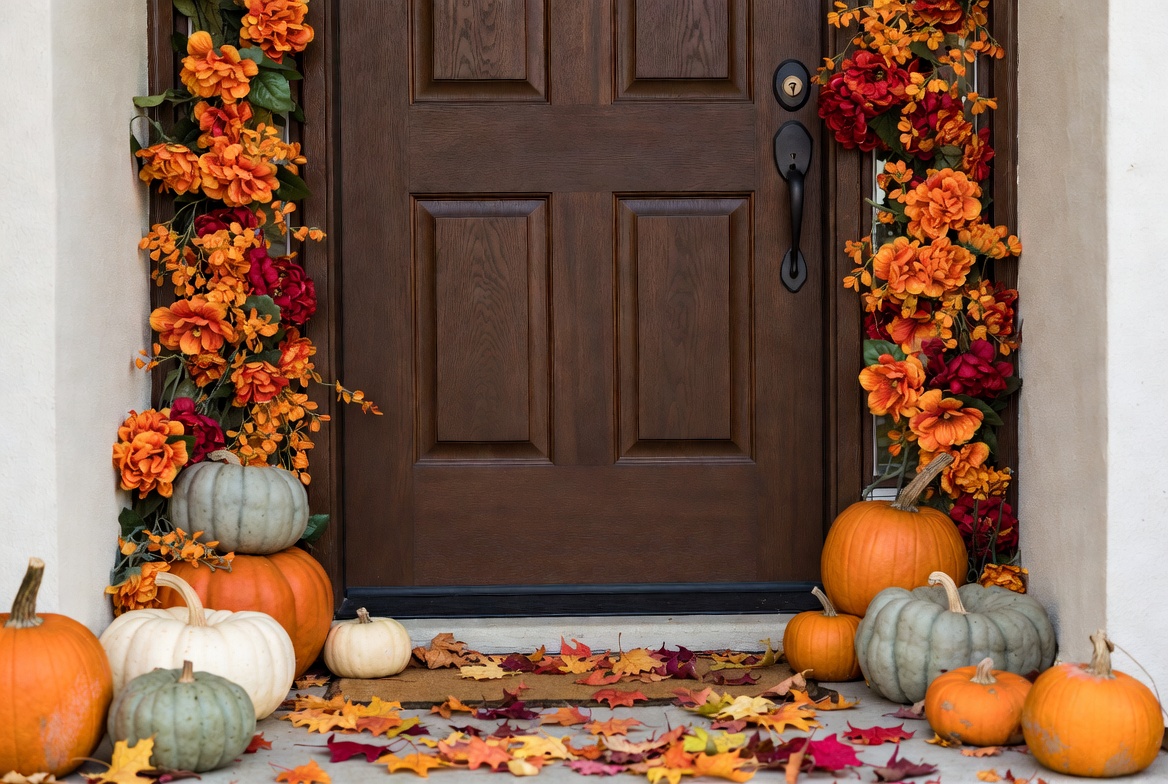 Colorful pumpkins and leaves surround a front door. Flowers and decorations showcase the autumn season.