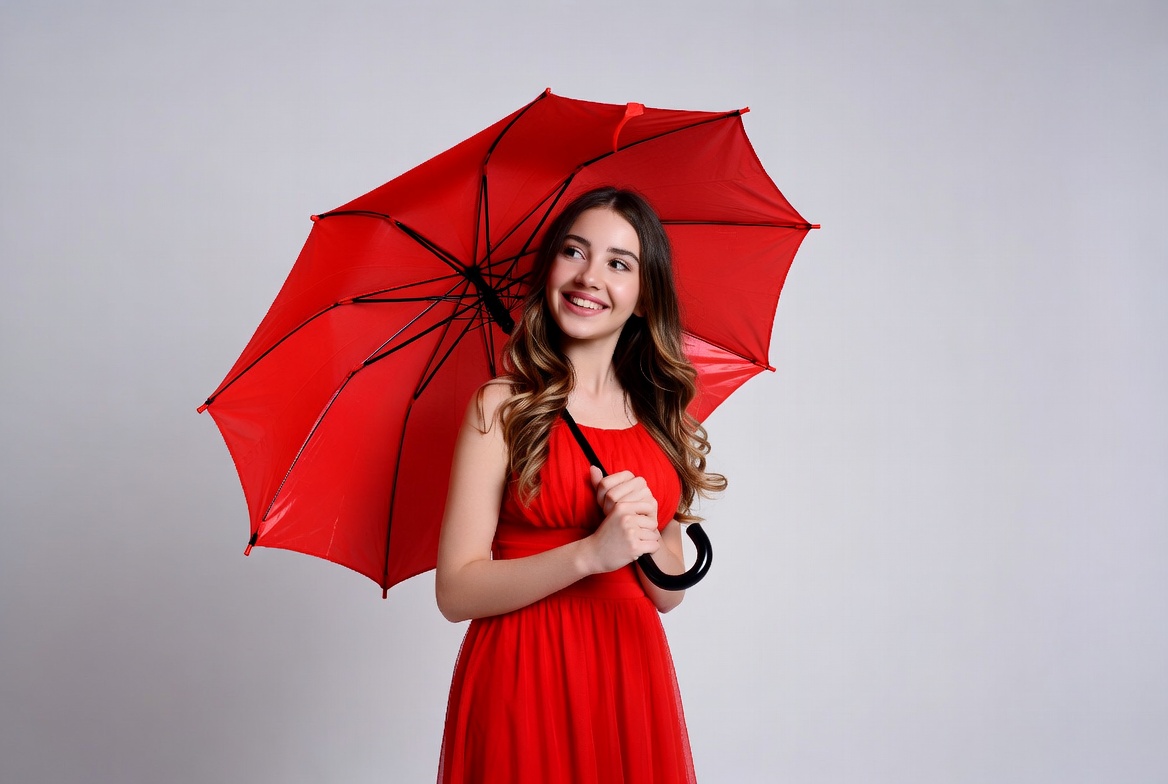 accessories, background, casual, dress, fashion, fun, hair, happiness, indoor, joyful, light, models, portrait, pose, red, smiling, standing, style, umbrella, woman