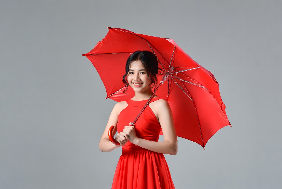 A woman smiles while holding a red umbrella. She wears a red dress and stands against a plain background.