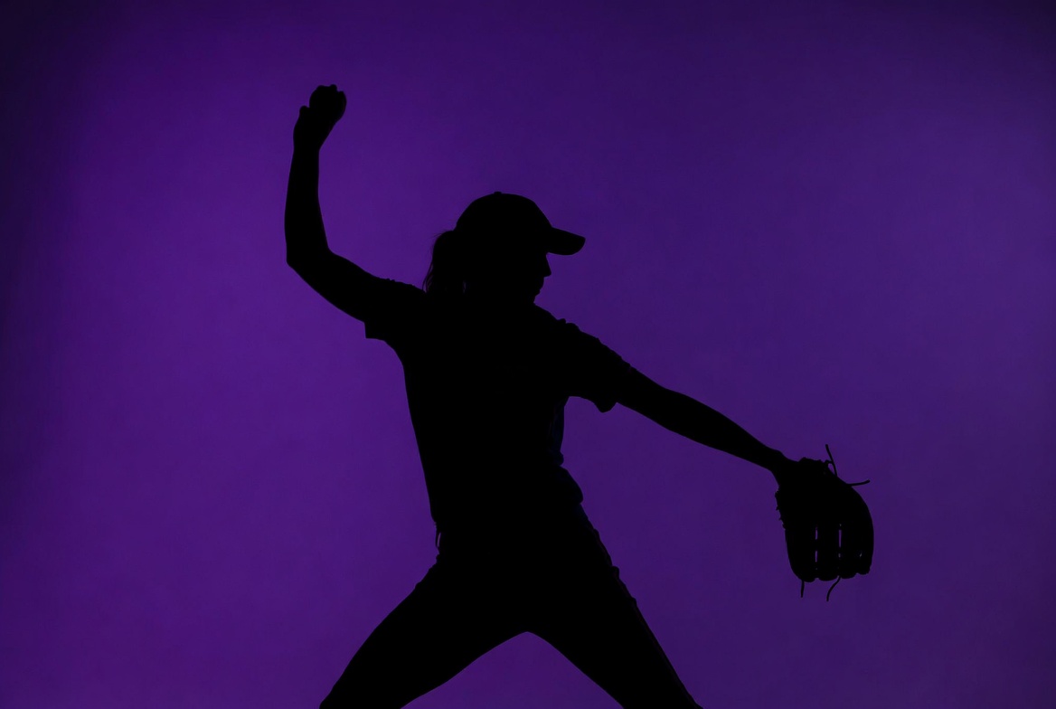 A female pitcher prepares to throw a baseball in the dark, outlined against a purple background, focusing on her stance and movement.