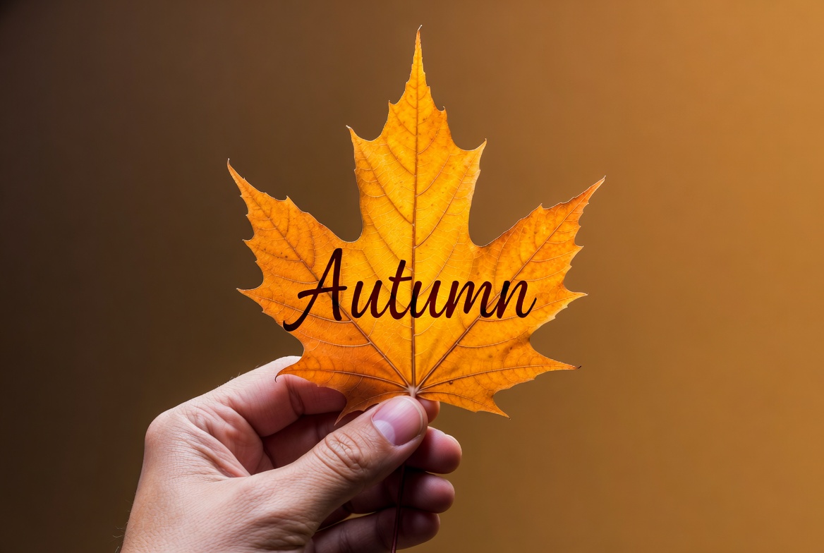 A person holds a bright yellow leaf in their hand, displaying the word autumn. The background has warm colors suggesting fall.