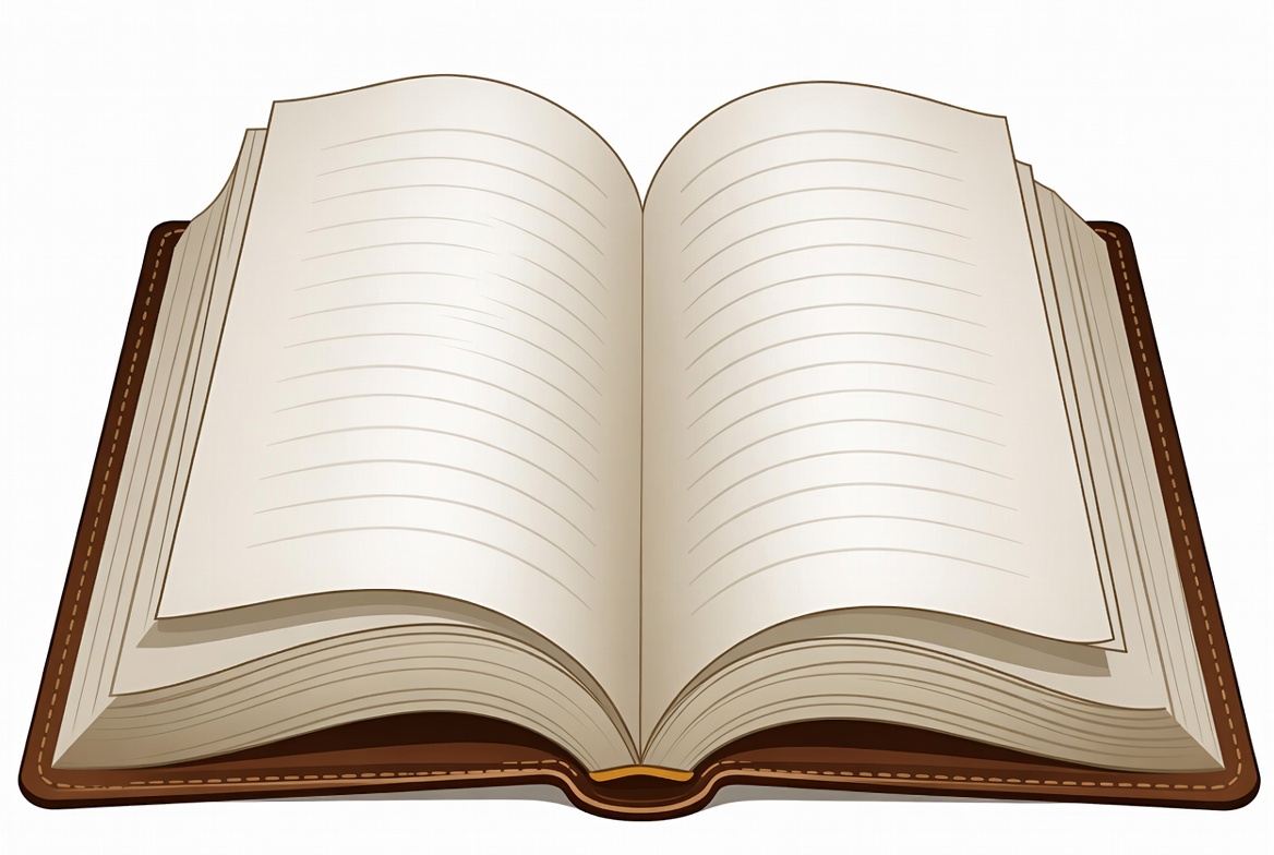 An open book sits on a flat surface, showing blank pages waiting for words or drawings. The book has a brown cover and shows no visible text.