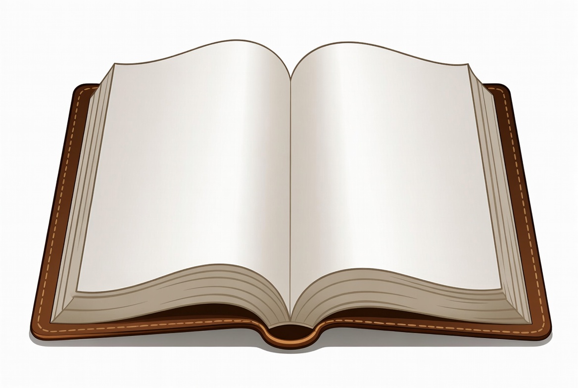 A blank book rests on a flat surface showing empty pages. The book’s cover is brown with stitching along the edges.