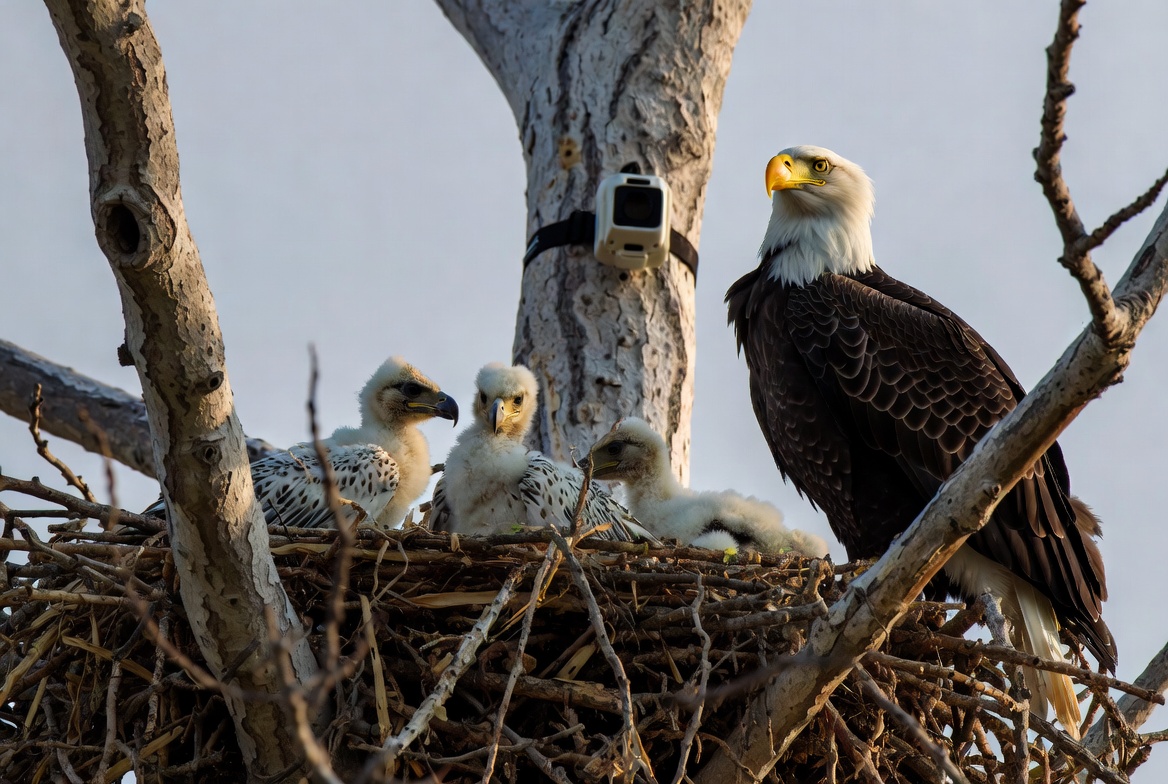 animal, animal behavior, avian, bald eagle, bird, daylight, eaglets, ecosystem, feathers, habitat, maternal care, nature, nest, nestlings, observation, outdoors, parenting, river, tree, wildlife