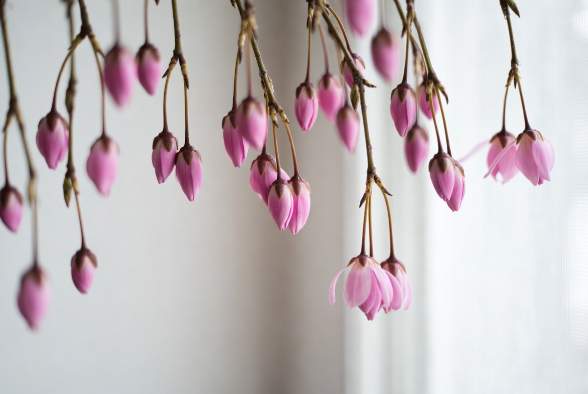 Branches with pink cherry blossoms hang indoors near a window, showcasing their delicate beauty and intricate shapes during the spring season.