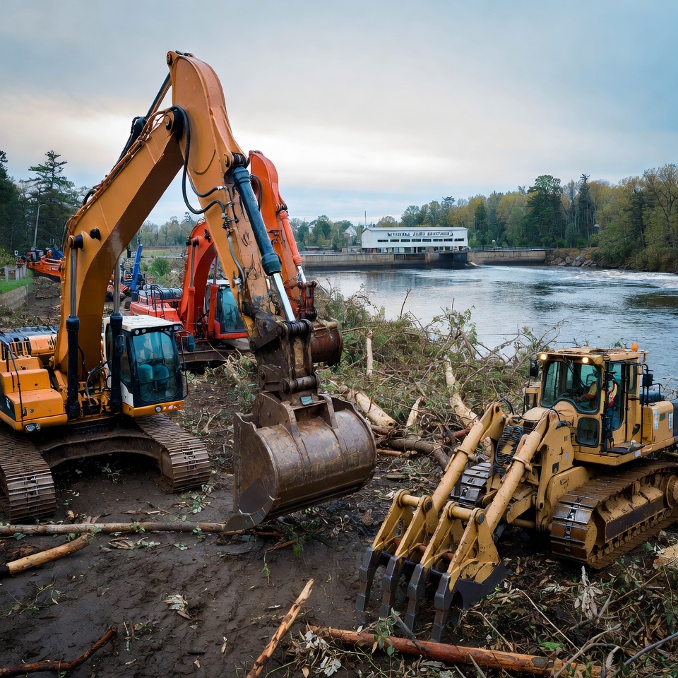 bulldozer, cleanup, construction, debris, digging, earthmoving, environment, equipment, equipment operators, excavator, heavy machinery, landscape, removal, river, safety, site, storm damage, tools, trees, workers