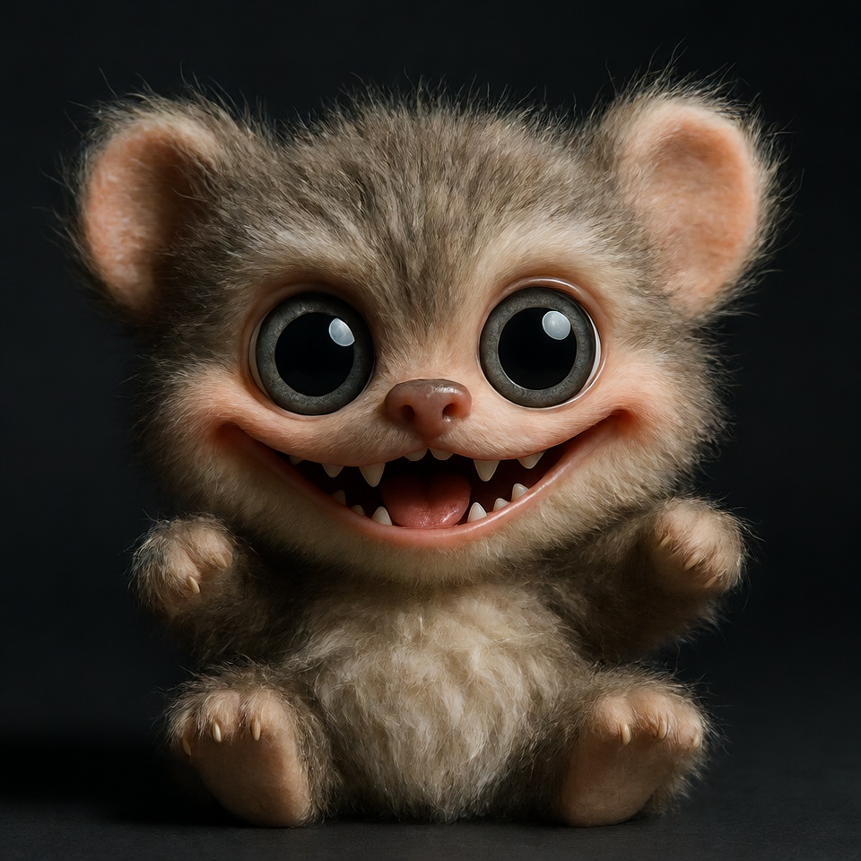 A small, fluffy creature with large eyes and a wide smile sits against a dark background. It looks playful and cheerful.