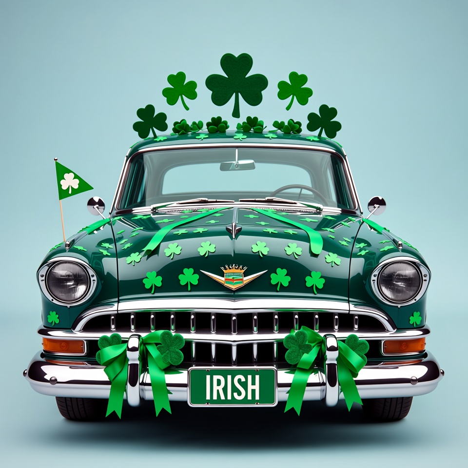 Green classic car decorated with shamrocks and ribbons is ready for a St. Patrick's Day event. The festive design shows Irish spirit.