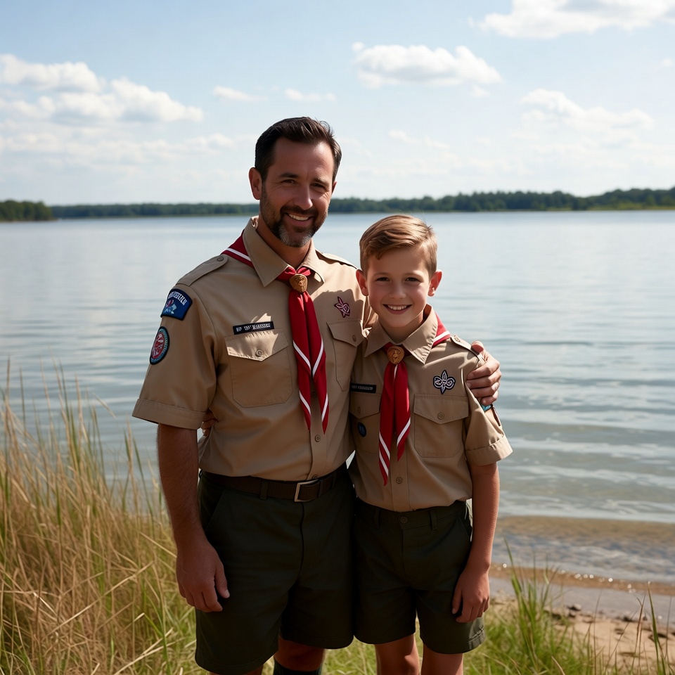 A man and a boy stand together near a lake. They wear uniforms with badges and ties. The sky is clear, and the water is calm.