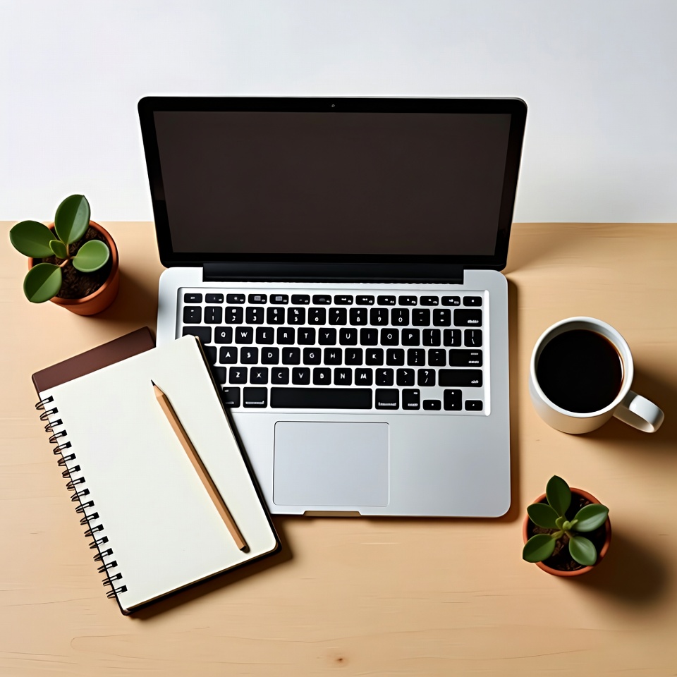 ambiance, coffee, cozy, creativity, design, desk, home office, laptop, minimalism, modern, notebook, pencil, plants, productivity, stationary, tea, technology, work, workspace, writing