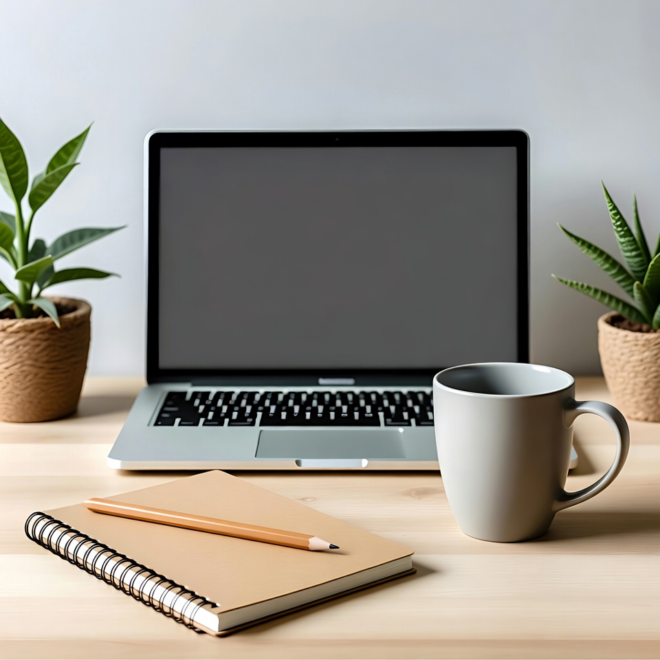 coffee, cup, decoration, desk, home office, laptop, minimal, notebook, office, organization, pencil, plants, productivity, study, tea, wooden, work, work area, workspace, writing