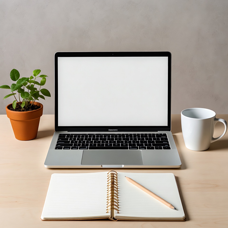 A laptop sits on a desk next to a notebook, plant, and cup. The setting is simple and organized, ready for working or studying.