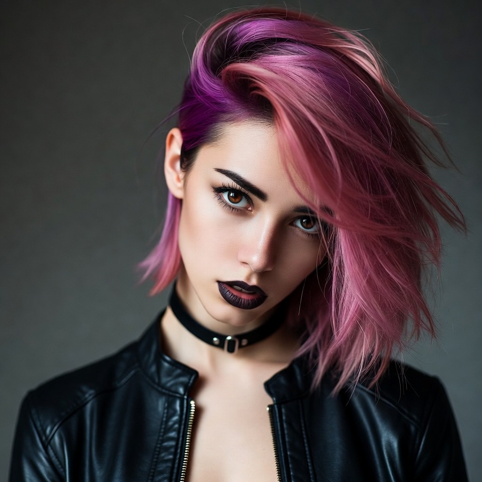 alternative, beauty, confidence, creative, dark lipstick, edgy, expression, fashion, gray backdrop, hairstyle, leather jacket, makeup, model, photoshoot, pink hair, portrait, studio, urban style, young woman, youth