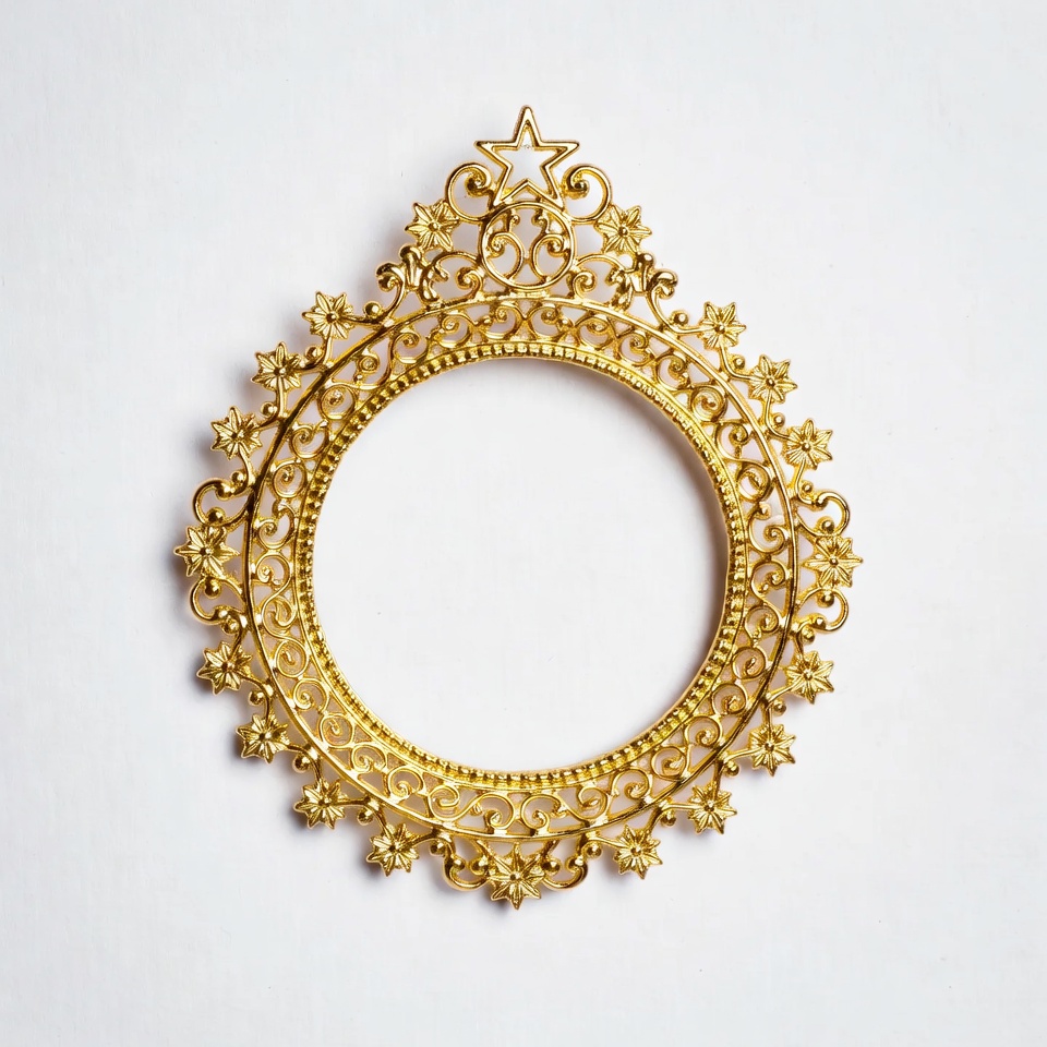 art, craftsmanship, decorative design, design details, display, embellishment, gold frame, handmade item, holiday decor, hollow frame, home decor, interior decoration, intricate patterns, ornate design, round frame, star shape, symmetrical shape, vintage style, wall art, white background