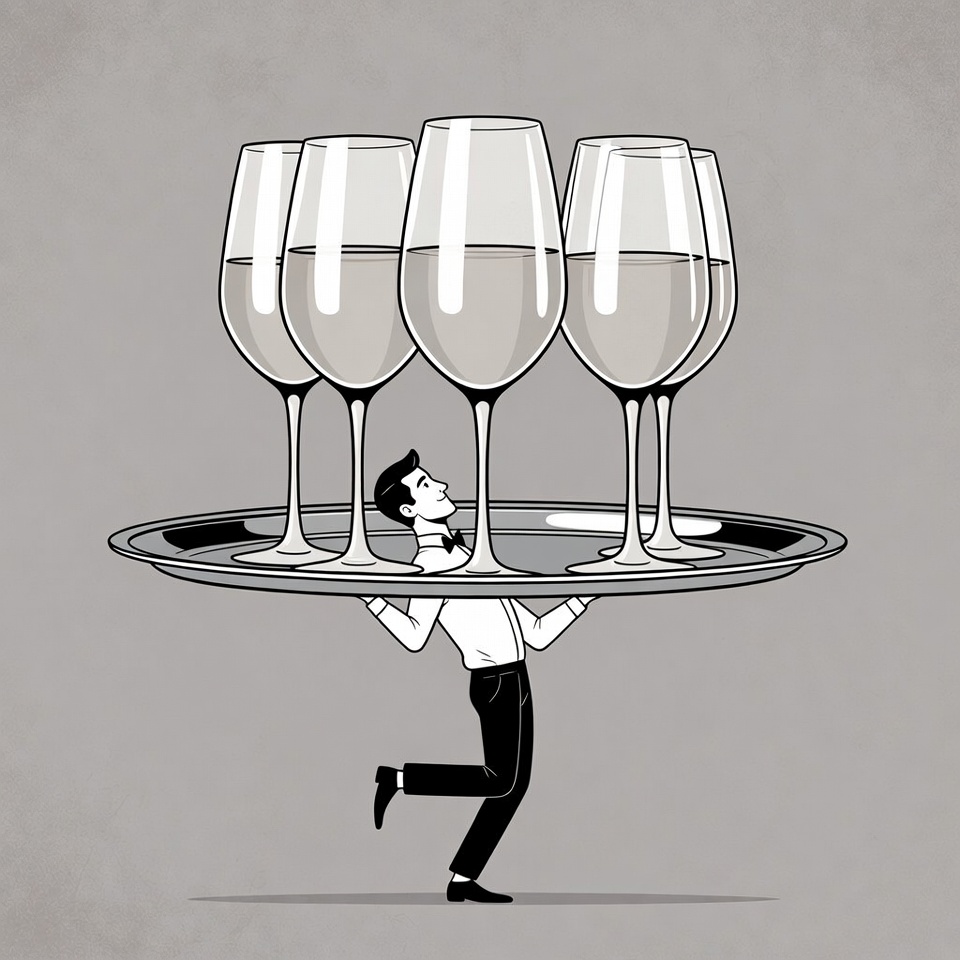 A waiter walks while balancing a tray of empty glasses. The scene shows the effort of serving drinks in a restaurant setting.
