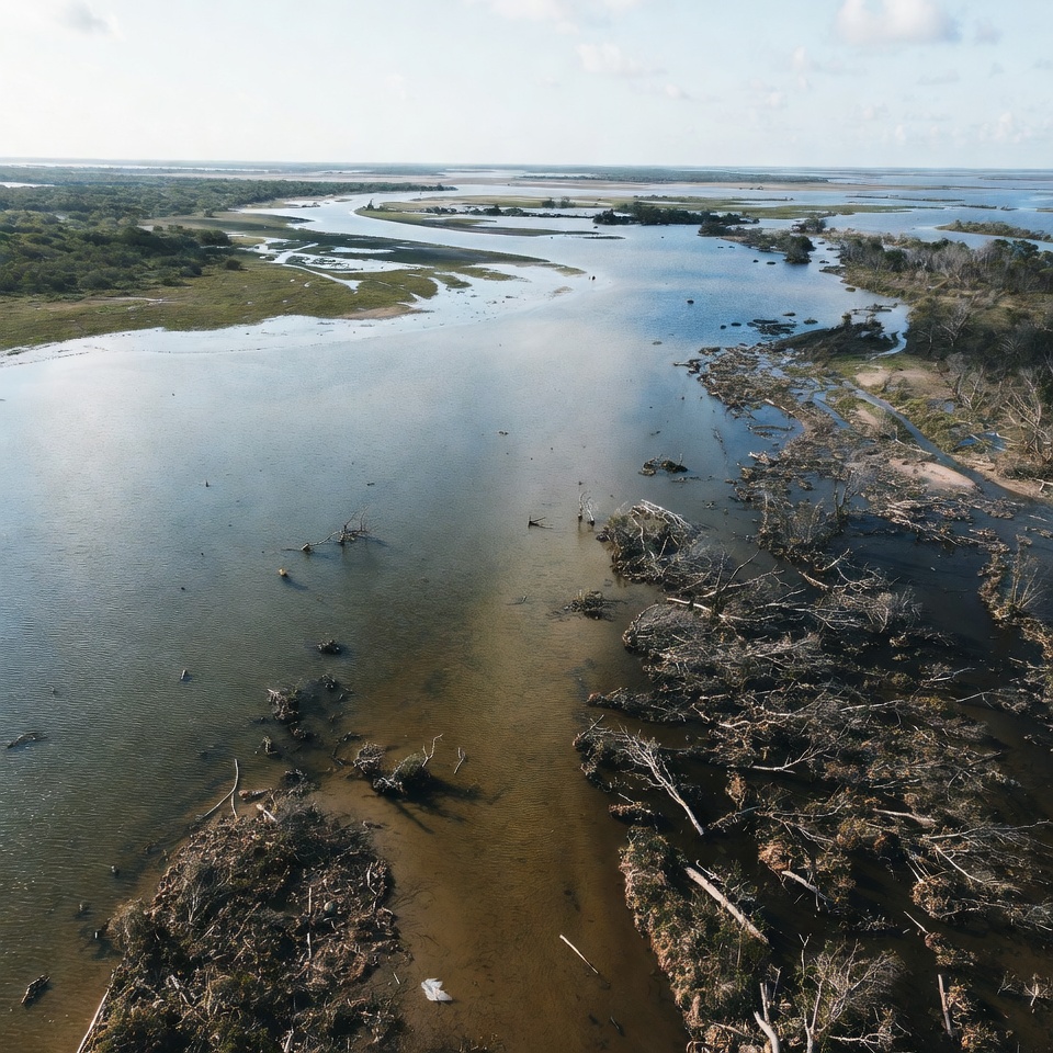 A wide view shows a wetland area with flowing water. Trees are downed in the water and along the banks. The sky is clear and blue.